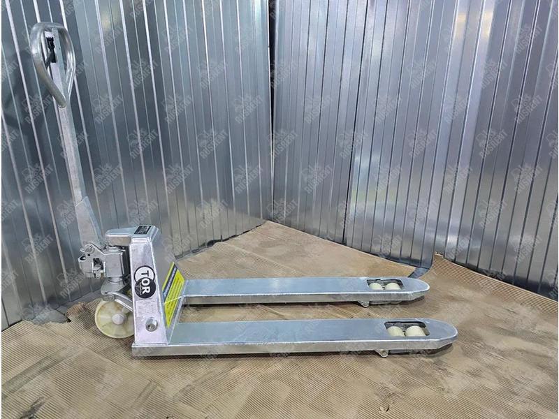 Тележка гидравлическая 2500 кг 1150 мм TOR WH-25G оцинкованная (нейлоновые колеса) предназначена для эксплуатации в агрессивной среде. Соляные растворы, кислотные, щелочные растворы повышенная влажность. Оцинкованное покрытие позволяет тележке прослужить в этих средах горазда дольше. Грузоподъемность тележки составляет 2,5 т, и она предназначена для работы со стандартными евро паллетами.