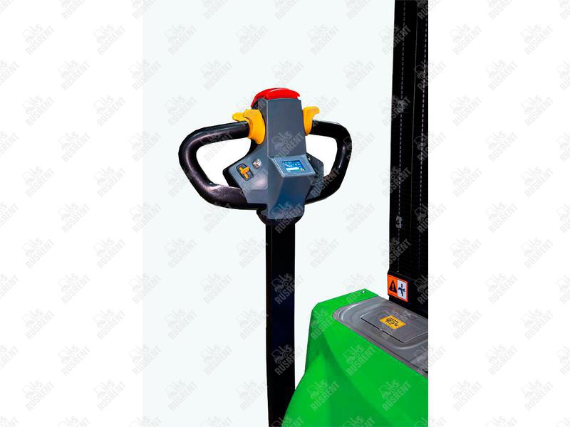 Известные проблемы с резким стартом двигателей подъема и сложность — в связи с этим плавно и безопасно опустить груз решено с помощью плавного пуска, управление плавным спуском/подъёмом встроено в ручку. Также при опускании груза на землю на уровне 10 см штабелер автоматически снижает скорость опускания вил, что предотвращает риски повреждений при работе с хрупким грузом. За безопасность оператора отвечает установка датчика на уровне 600 мм. При поднятых вилах до этого уровня штабелер автоматически замедляет скорость передвижения, что удобно при позиционировании груза. В остальном это классический штабелер лёгкого класса, который эффективно работает на небольших складах и магазинах за счет небольших габаритов и маневренности.