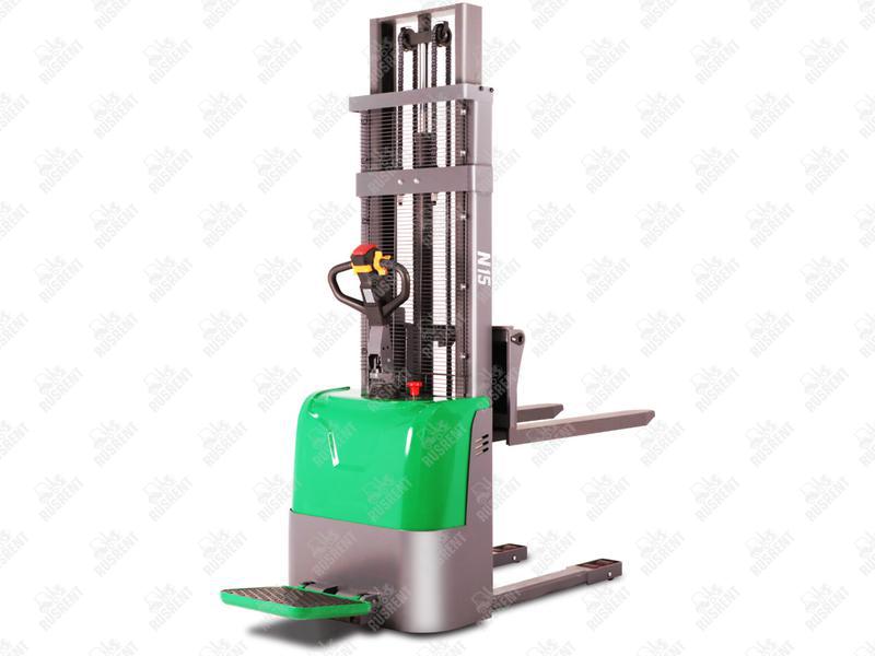 Штабелёр оснащён платформой для оператора, в которой он полностью защищён от нежелательного контакта с грузами. Данный штабелёр работает от электричества не только на подъём, но и на передвижение в горизонтальной плоскости. Обладает лёгким и удобным управлением, высокой манёвренностью.